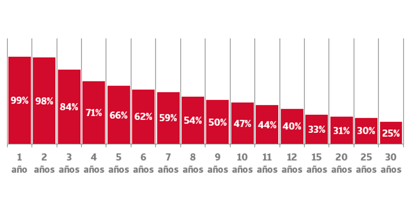 En los años siguientes las tasas de mortalidad empresarial se suavizan ligeramente. De acuerdo con el estudio de Iberinform, dos de cada cuatro proyectos empresariales no llegan a cumplir el décimo año, donde la tasa de supervivencia cruza el ecuador y queda recortada al 47%. A los 15 años la tasa de supervivencia se limita ya al 33%. Es un punto de giro en la madurez de las empresas españolas. A partir de ese momento, las posibilidades de supervivencia aumentan sensiblemente. En los quince siguientes años de vida apenas se suman ocho puntos a los ceses de actividad. Una de cada cuatro empresas logra cumplir los 30 años.